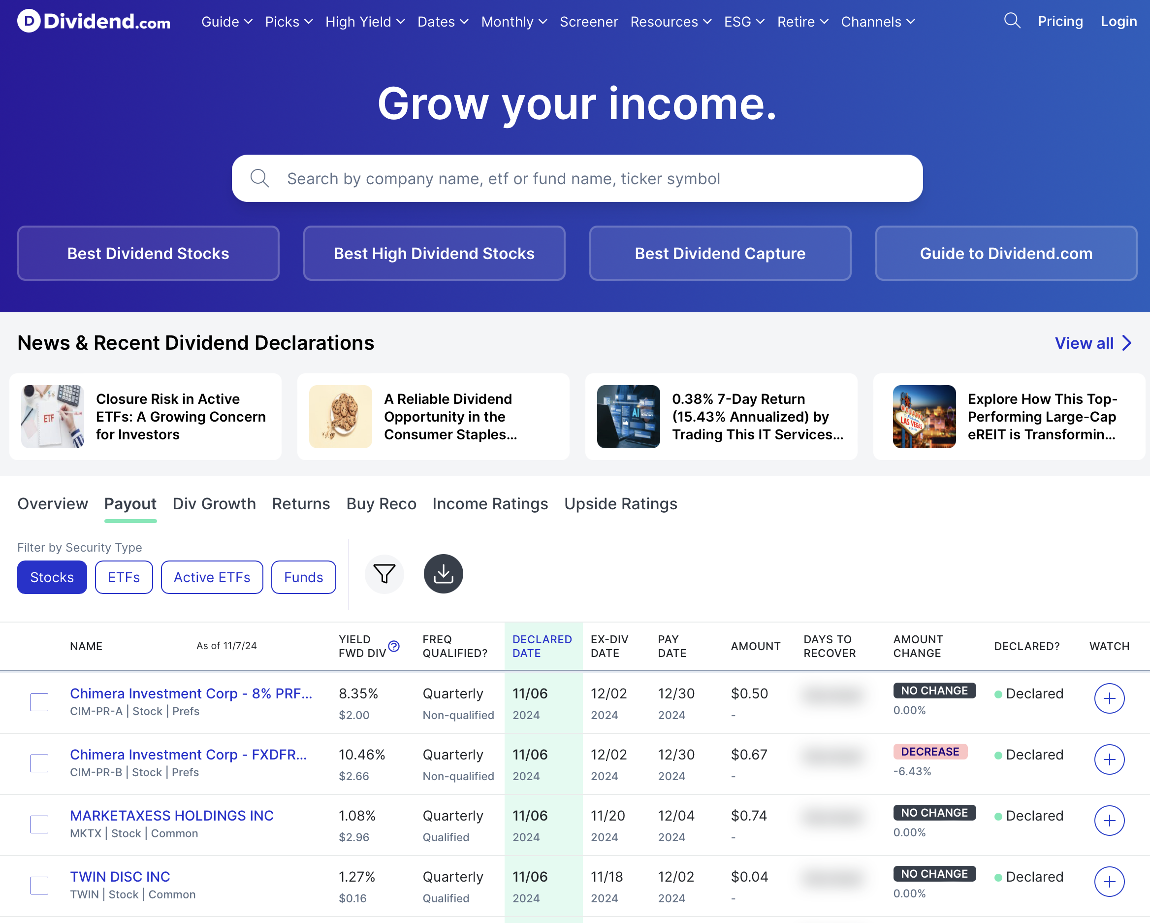 디비던드닷컴은 미국 배당주 투자를 시작하는 사람들이 가장 많이 찾는 대표적인 정보 제공 사이트입니다. 이곳은 종목별 배당일, 배당률, 배당락일을 포함한 배당 관련 정보를 체계적으로 제공합니다. 특히 배당 히스토리를 확인할 수 있어 과거 배당 내역과 변동률을 분석하는 데 유용하며, 이를 통해 안정적인 배당을 제공하는 기업을 선별할 수 있습니다.