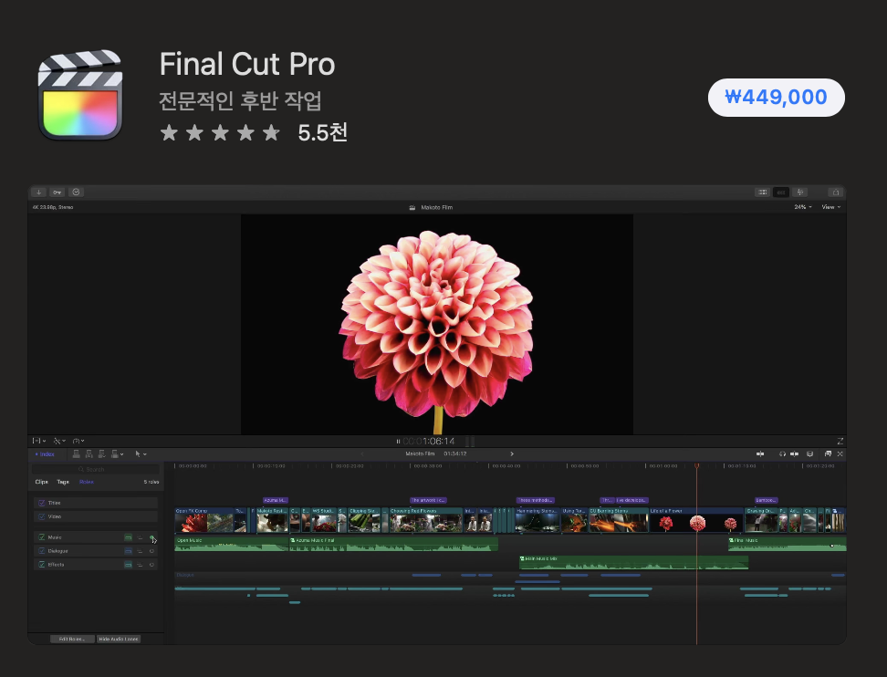 저는 원래 어도비 프리미어와 각종 어도비 프로그램을 사용하는 사람인데, 이번에 맥북을 구매하면서 파이널 컷을 사용하려고 앱스토어에 들어갔더니 가격이 무려 449,000원?! 사용해보지도 않고 덜컥 구매하기엔 가격이 조금 부담이 되어 무료로 사용할 수 있는 방법이 있나 찾아보게 되었습니다.