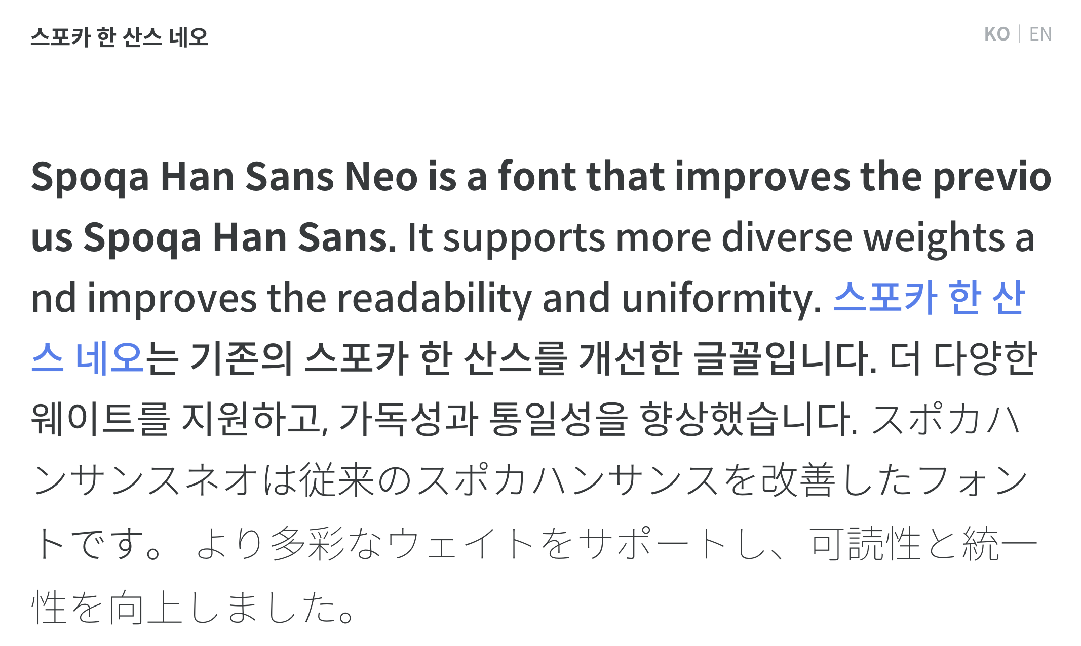 스포카 한 산스는 간결하고 깔끔한 고딕 스타일이 특징인 것 같습니다. 웹사이트와 앱 디자인에 널리 사용되며, 본문과 제목 모두에서 가독성을 유지할 수 있도록 다양한 굵기를 지원하고 있습니다.