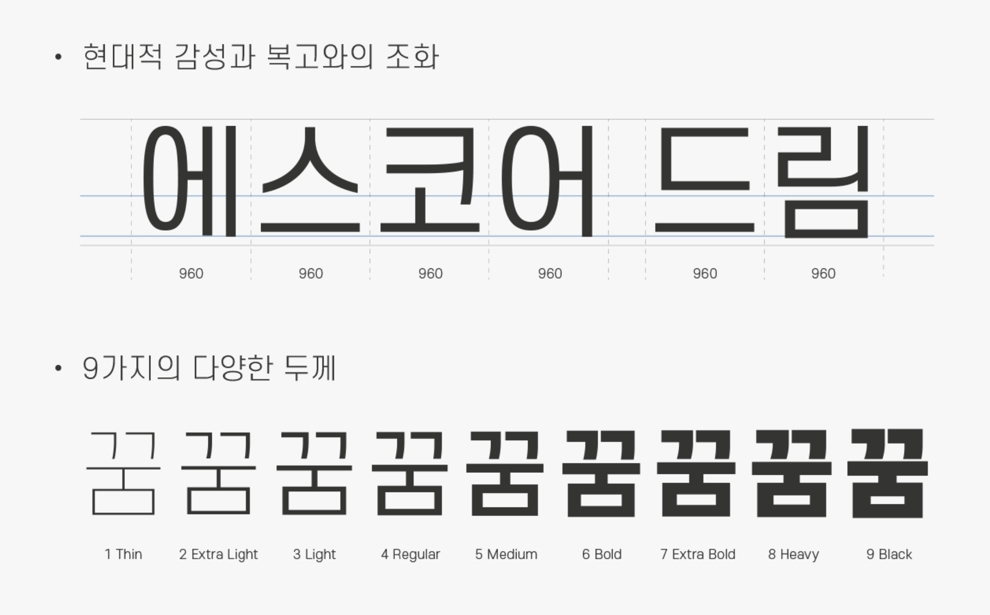 네이버와 함께 개발된 에스코어 드림은 안정적인 글자 구조와 다양한 굵기로 본문, 제목, UI 디자인 등 모든 용도에 적합한 고딕 폰트입니다. 가독성이 뛰어나다고 생각하고, 깔끔하고 모던한 디자인 덕분에 예전부터 오랫동안 이용되고 있는 폰트입니다.
