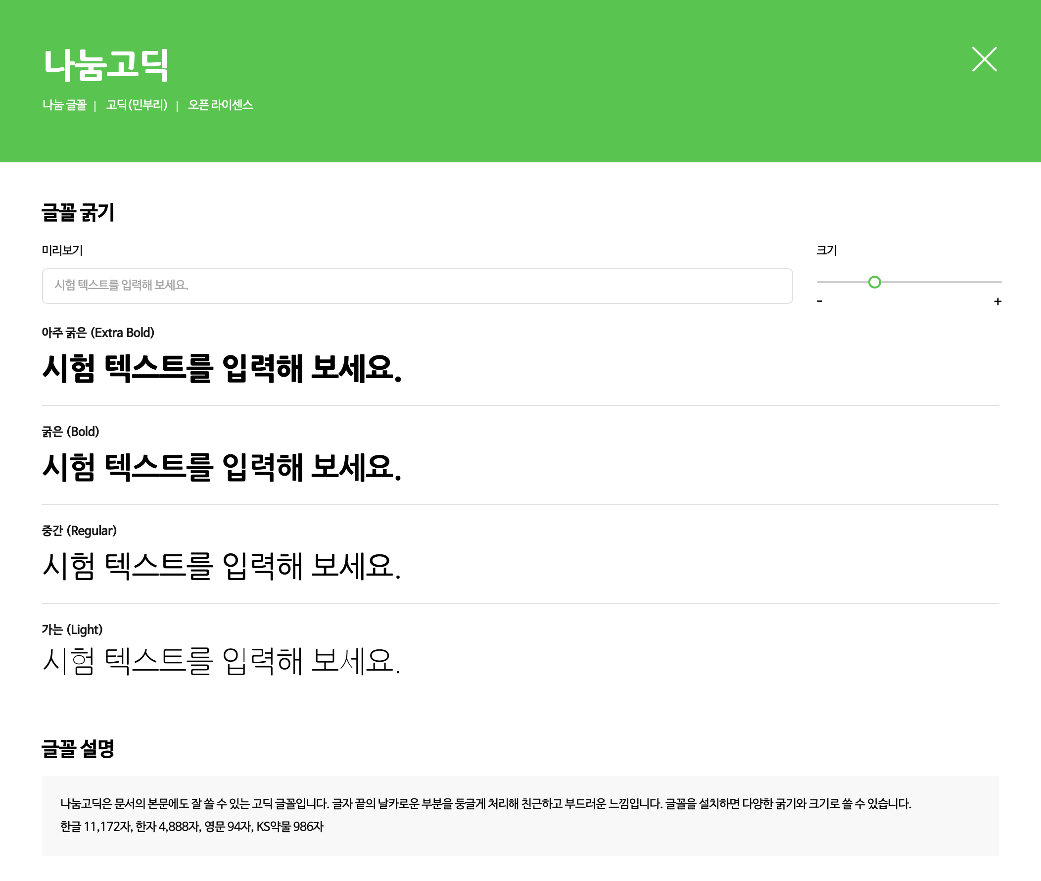 네이버에서 제공하고 있는 나눔고딕은 가장 널리 사용되고 유명한 고딕체 중 하나입니다. 다양한 굵기를 지원하는 것은 물론 어디에나 어울리는 높은 가독성을 가진 폰트입니다.