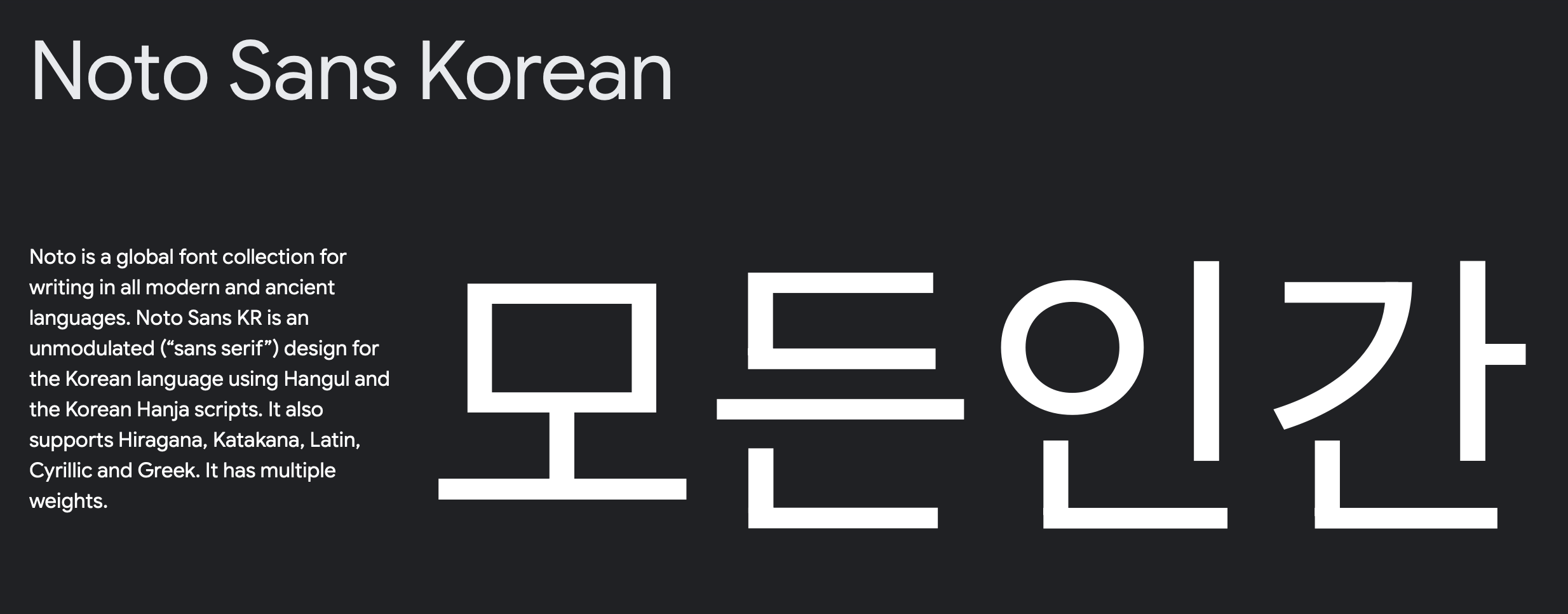 구글과 어도비가 공동으로 개발한 본고딕 (Noto Sans KR)은 다국어 지원을 위해 제작된 글로벌 폰트라고 합니다. 한국어를 포함한 다양한 언어를 일관된 스타일로 표현할 수 있으며, 간결하고 현대적인 고딕체로 평가됩니다. 웹디자인이나 모바일 앱 UI 디자인에 특히 적합하다는 평가입니다.
