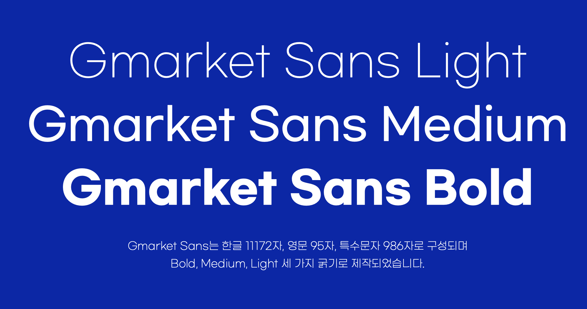 지마켓에서 제공하는 지마켓 산스는 깔끔하고 정돈된 고딕체입니다. 다양한 굵기를 제공하여 웹디자인, 포스터, 프레젠테이션 등 다양한 디자인에 활용되고 있습니다. 얇은 서체에서 굵은 서체까지 다양한 굵기를 지원하기 때문에 텍스트 강조와 가독성을 모두 잡을 수 있는 폰트라고 생각합니다.