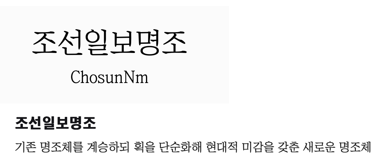 조선일보명조는 조선일보에서 제공하는 명조체 폰트입니다. 깔끔하고 단정한 글자 형태가 특징. 주로 신문 기사나 문서 작성에서 많이 사용되며, 전통적인 명조체의 정갈함을 잘 살린 디자인입니다. 글자 구조가 안정적이기 때문에 본문용 폰트로 많이 사용되고 있으며, 긴 글을 읽을 때도 눈에 피로감이 덜하다는 장점이 있습니다.