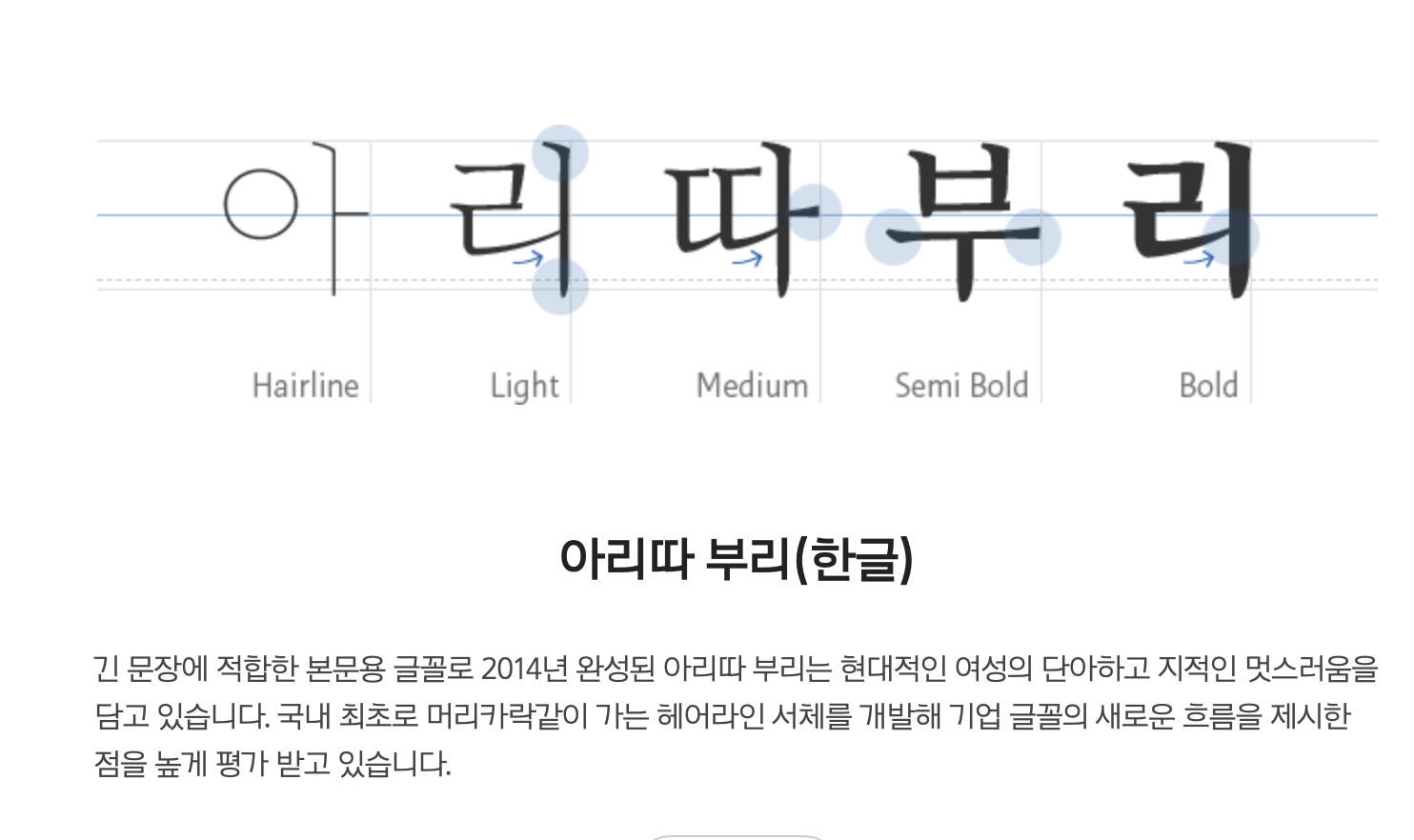 아리따부리는 아모레퍼시픽에서 제공하는 명조체 폰트입니다. 단정하고 세련된 디자인이 특징. 고급스럽고 여성스러운 느낌을 주어 뷰티 관련 디자인에서 자주 사용된다고 합니다. 정형화된 명조체의 틀을 벗어나 부드럽고 감성적인 분위기를 연출할 수 있어 다양한 용도로 활용 가능합니다.