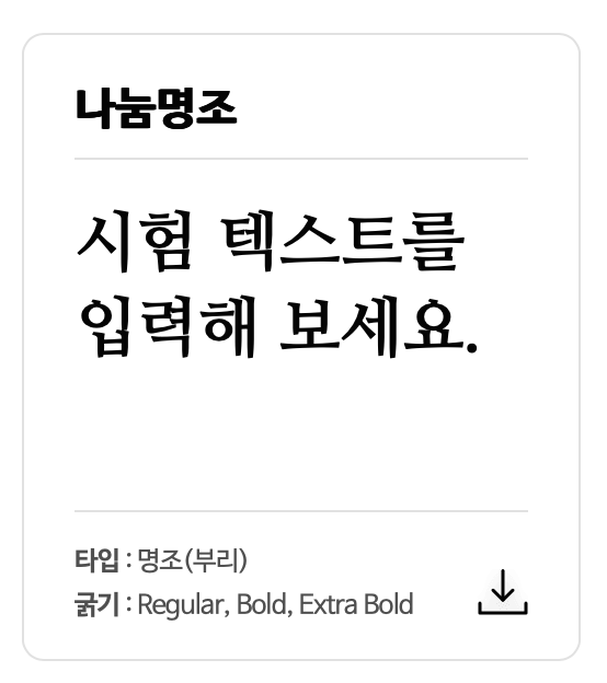 나눔명조는 네이버에서 제공하는 대표적인 명조체 폰트입니다. 안정적인 글자 구조와 높은 가독성이 특징. 다양한 굵기를 제공하여 본문용, 제목용으로 모두 활용할 수 있습니다. 깔끔하고 단정한 명조체의 정석 폰트입니다.